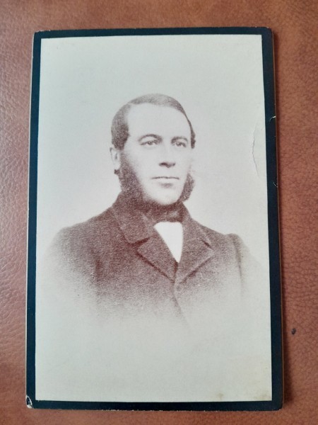 Fotografie barbat cu perciuni, pe carton, sfarsit de secol XIX