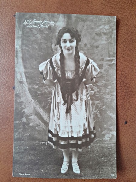 Fotografie tip carte postala, Annie Aurian in piesa Soldatul Mariei, inceput de secol XX