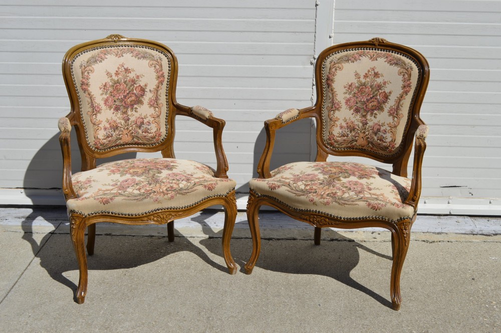 Set 2 fotolii in stil francez, din lemn masiv de stejar, cu sculptura manuala, tapisrie goblen , perioada 1920