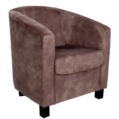Fotoliu tip scoica, tapitat cu stofa maro.