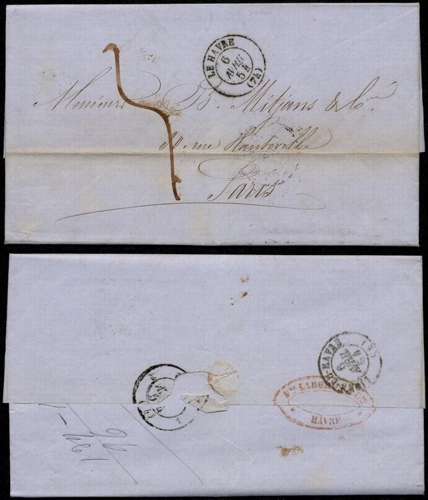 France 1854 Stampless Cover + Content Le Havre to Paris - Ligne du Havre D.852