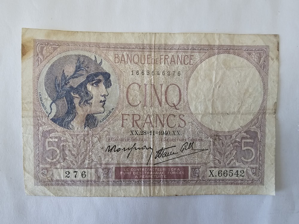 Franta 5 francs 1940,av.cont=17 lei,colet plata ramburs+plic