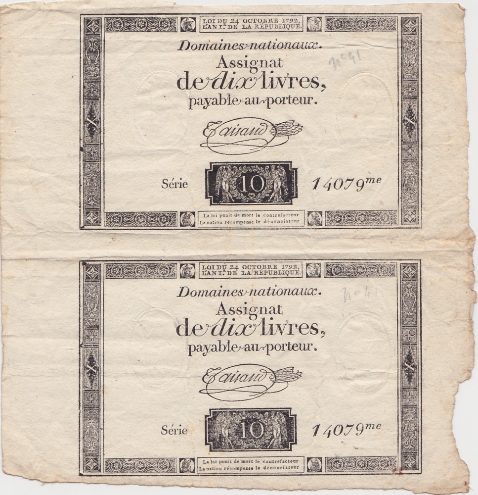 FRANTA ASIGNATA 2 X 10 LIVRES OCT 1792 SIGN. Taisaud WTMK. RP FR COALA NETAIATA