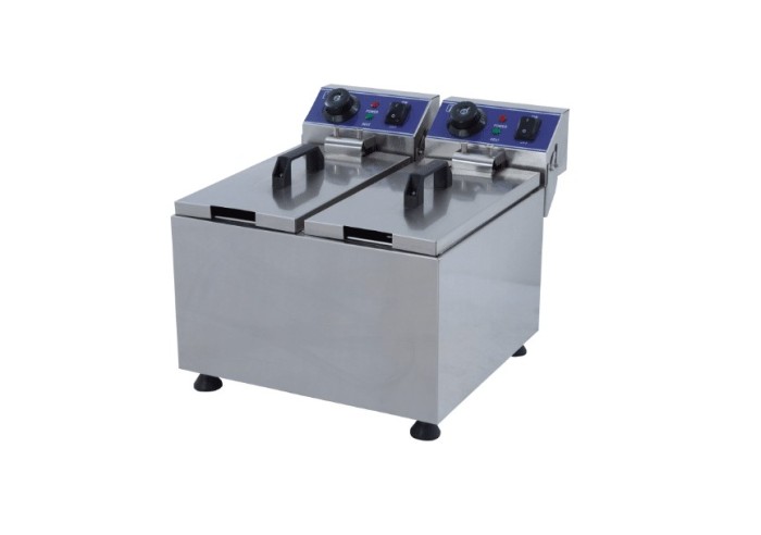 Friteuză dublă 5000W 2*6L Simplu și sigur: mânerele capacului și coșului sunt izolate termic. Este posibil să puneți coșul cu delicatesele gătite pe o margine specială pentru a scurge uleiul. Reziduurile care cad din coș sau se scufundă pe fundul cuvei în timpul răcirii sunt colectate la fund, astfel încât uleiul își păstrează aroma și poate fi folosit mai mult timp. Când se termină munca, uleiul folosit poate fi îndepărtat convenabil prin robinetul de scurgere. Performanțele sale superioare, calitatea materialelor și construcția robustă o fac potrivită pentru utilizarea în bucătăriile profesionale, în timp ce prețul ei accesibil o face o alegere bună și pentru uz casnic.