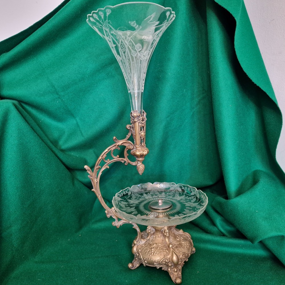 Fructiera cu soliflora din alama cu cristalul original gravat manual în Bohemia - AUSTRIA anii 1880, stare perfecta, dim: h. 58/23 cm