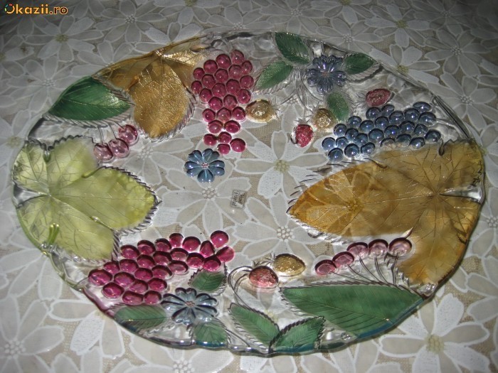 Fructiera mare din sticla colorata, model struguri, manual pictata, L-41, l-34 cm, cu defect de zgarietura pe spate, vizibil poza.