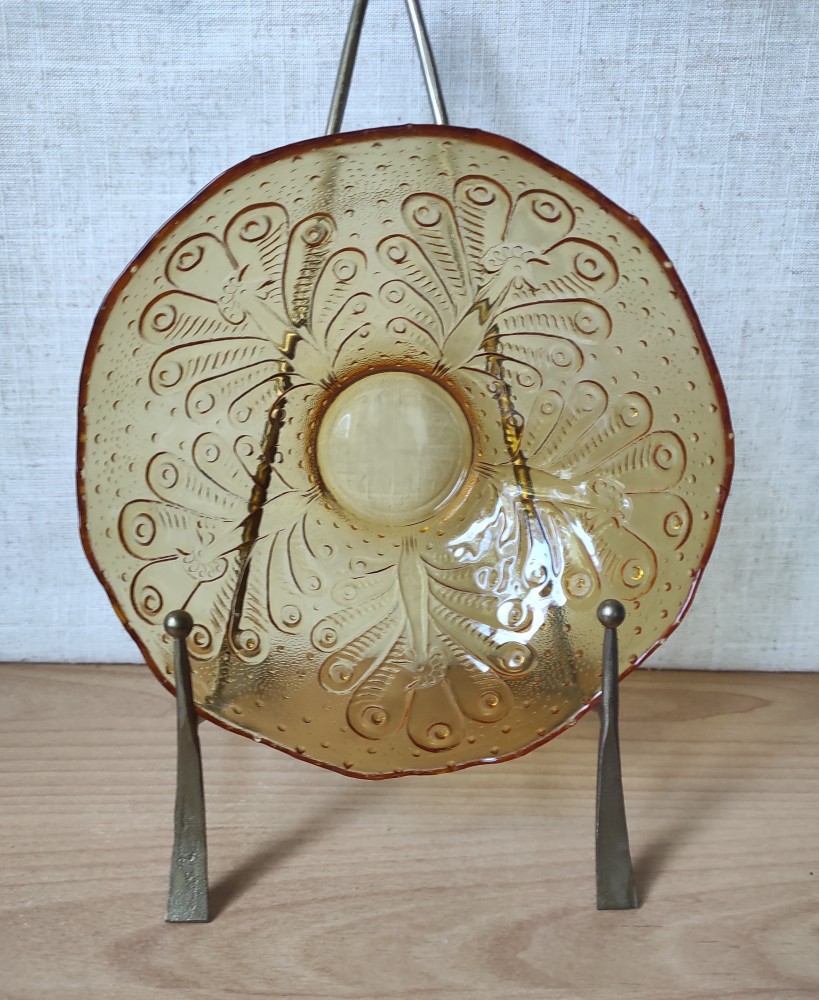 O fructieră superbă, vintage, din sticlă de culoare amber, cu marginile ușor ondulate și model cu păuni în relief. Poate fi folosită ca fructieră, vas pentru flori, sau centru de masă.