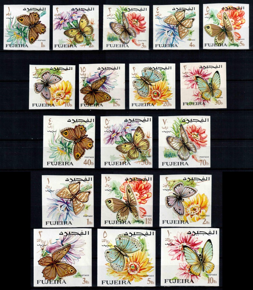 Fujeira 1967, Mi #159-176 B**, nedantelat, fauna, fluturi, MNH, cota 24 €!