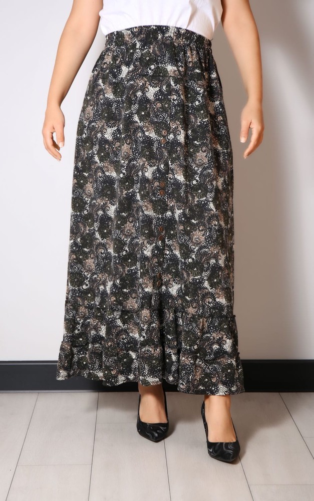 Fusta lunga cu doua volane accesorizata cu nasturiMaterial: Jerse Imprimat.Marime Universala ,se potrivesc de la M la 10XL ( 42 la 60) EUFara Captuseala , Materialul nu necesita!Potrivit pentru sezon.