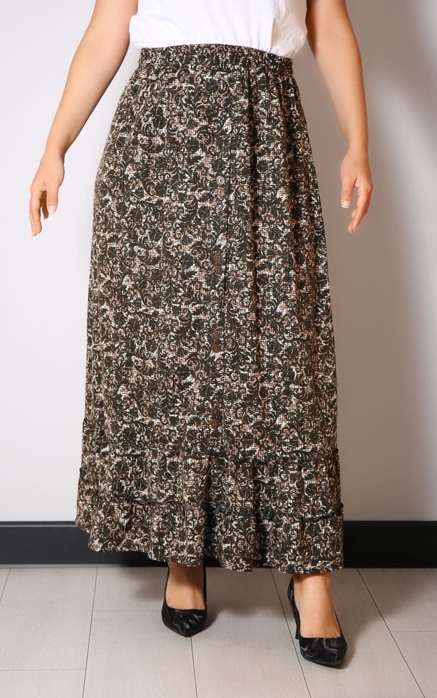 Fusta lunga cu doua volane accesorizata cu nasturiMaterial: Jerse Imprimat.Marime Universala ,se potrivesc de la M la 10XL ( 42 la 60) EUFara Captuseala , Materialul nu necesita!Potrivit pentru sezon.