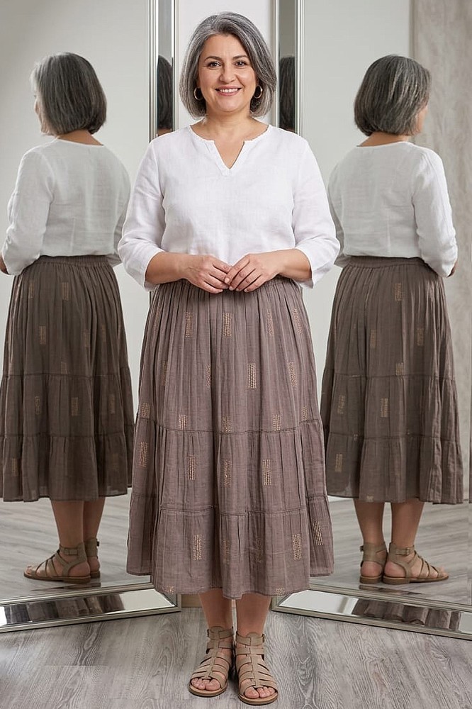 Fustă Lungă Creponată din Vâscoză și Bumbac Premium – Eleganță și Confort (90 cm)Redescoperă plăcerea de a purta materiale naturale cu această fustă lungă de 90 cm, creată special pentru femeia care pune preț pe calitate și rafinament. Cu o textură deosebită, ușor creponată, această piesă devine rapid elementul central al oricărei garderobe versatile.De ce să alegi această fustă?Material de înaltă calitate: Combinația ideală de vâscoză și bumbac oferă o senzație fină pe piele, lăsând corpul să respire, în timp ce elastanul adaugă flexibilitatea necesară pentru libertate totală de mișcare.Textură "Creponat" Modernă: Aspectul ușor șifonat nu este doar un detaliu de design sofisticat, ci și unul practic – fusta își păstrează forma impecabilă pe parcursul întregii zile fără a necesita călcare intensă.Croială Lungă și Fluidă: Cu o lungime de 90 cm, fusta oferă o siluetă alungită și elegantă, potrivită atât pentru ținute office, cât și pentru ieșiri relaxate de weekend.Detalii Tehnice:Compoziție: Vâscoză, Bumbac și Elastan (amestec premium).Lungime totală: 90 cm.Textură: Material creponat, dens și calitativ.Talie: Confortabilă (poți menționa aici dacă are elastic sau fermoar).Stil: Casual-Elegant / Boho-Chic.Recomandări de Stil:Datorită materialului plin și a texturii bogate, această fustă poate fi purtată cu:Look Office: O cămașă din mătase băgată în talie și pantofi cu toc mediu.Look Relaxat: Un tricou simplu din bumbac și sandale cu talpă joasă sau sneakerși albi.Look de Seară: Un top mulat și accesorii statement.Notă: Fiind un produs realizat din fibre naturale și elastan, materialul este extrem de rezistent la purtări repetate, păstrându-și culoarea și textura "ca nouă" pentru mult timp.