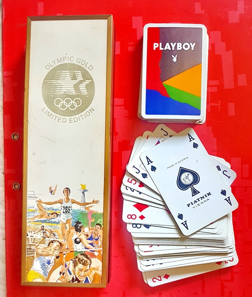 G471-I-Pereche Carti de joc vechi PLAYBOY PIATNIK VIENNA Austria-Editie Speciala-Olympic Gold Limited edition carton plastefiat completa+ unul incomplet. Cutia din aluminiu aurit foto color Jocurile Olimpice-Congress Mint Edition interior panza si catifea stare buna in patina timpului. Cartile de joc stare foarte buna. ATENTIE: 1 PACHET COMPLET SI UNUL CU PIESE LIPSA. Lipsa 8 bucati carti total din cel de al 2 lea pachet: 5 de trefla, 3 de inima, 3 de frunza si 3 de trefla, 2 de inima si 2 de frunza, 4 de frunza si de trefla. Cate 2 Jokeri. Piesa deosebita de colectie.