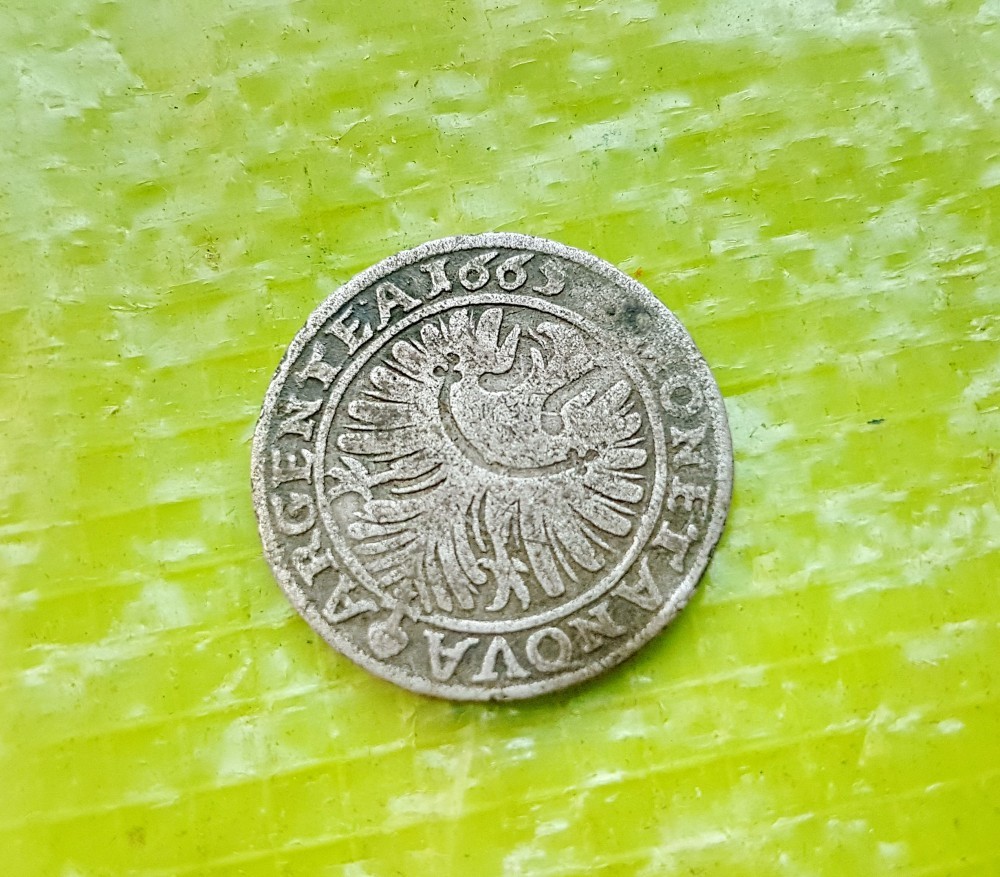 G509-Moneda antica colectie-Moneta Nova Argentea 1665. D.G. Christian VI DUX S. IB. Argint cca 3 cm. Piesa originala autentica.
