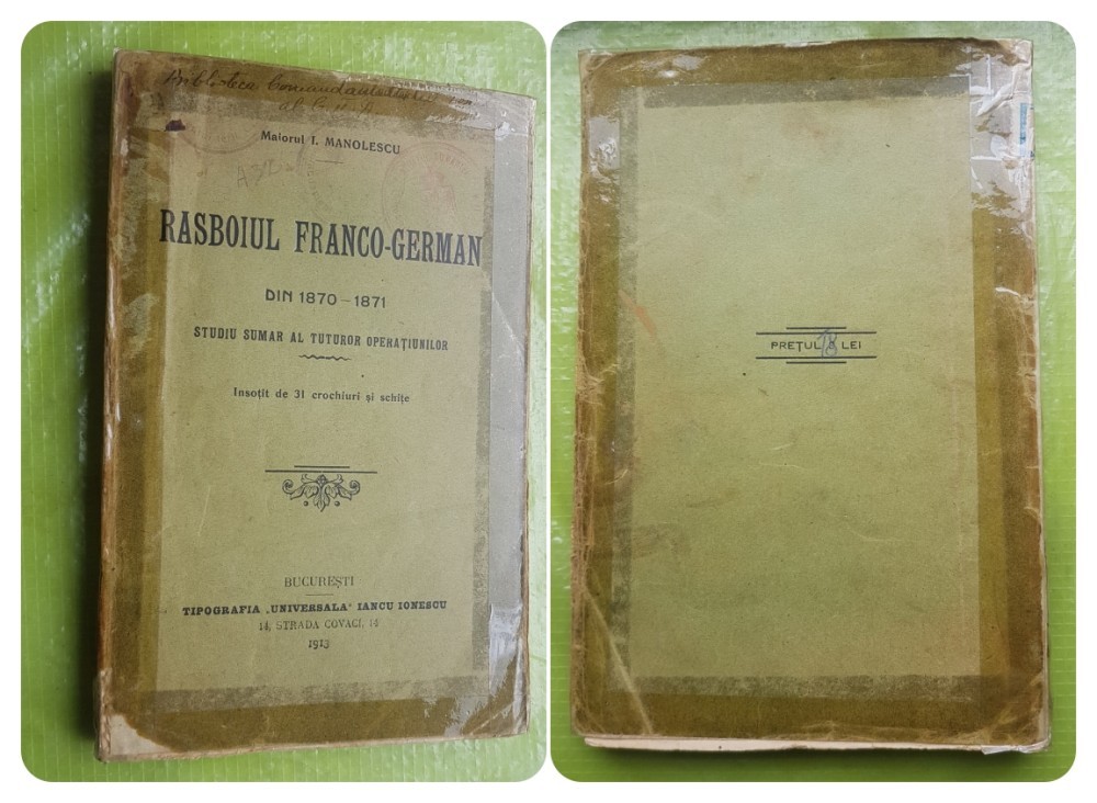 G599-Raritate-Editie veche militara-Razboiul Franco-German 1870-1871-Bucuresti 1913 Maiorul I. MANOLESCU cu ștampila Regatul Romaniei- C-tului C II A. Studiu sumar al tuturor operatiunilor. Tipografia Universala Iancu Ionescu. Marimi: 21/14 cm, 191 pagini. Stare buna interior, coperta initial pe margini mai uzata legata cu scotch.