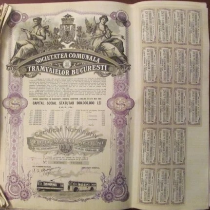 20 de actiuni in valoare nominala totala de 10000 lei deplin varsati "Societatea Comunala a Tramvaielor Bucuresti 1945" - stare (foarte) buna; unele ondulari ale hartiei (foto).