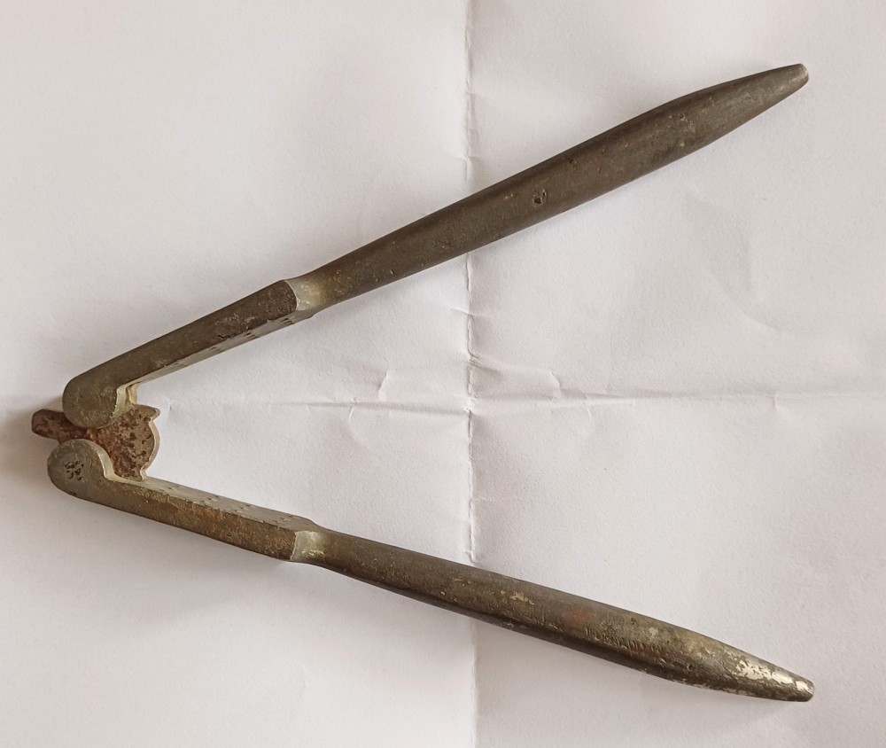 Spargator Cleste, vechi, pentru alune & nuci - otel nichelat; perfect functional; dimensiuni maxime: 14,50 cm (lungimea) x 3,50 cm x 1,50 cm; greutate: 130 g; stare buna, estetica frumoasa (foto); prezinta, insa, exfolieri ale stratului de nichel, si unele pete de rugina (foto); articolul nu are vreun marcaj.