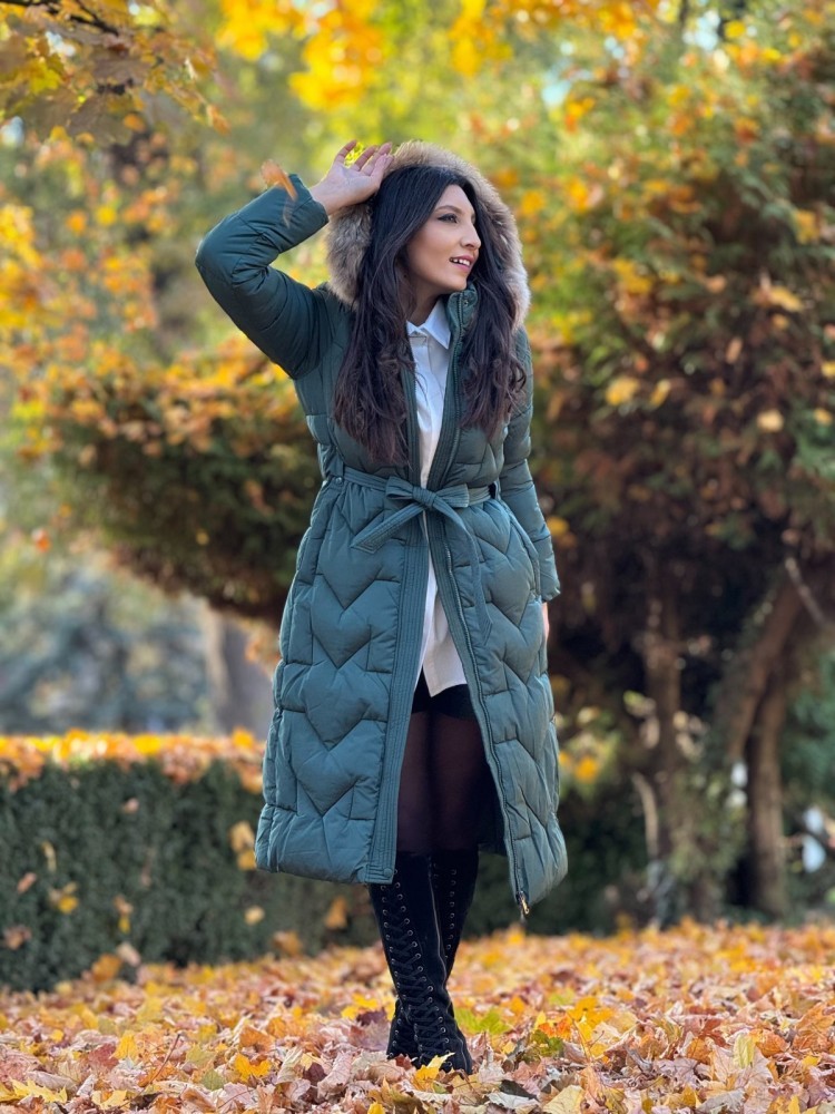 Această geacă lungă verde cu blană naturală și cordon în talie este definiția eleganței practice. Nuanța verde adaugă profunzime și rafinament, iar blana naturală de la guler oferă nu doar un accent luxos, ci și un plus de izolatie termică. Cordonul din talie îți permite să reglezi lejer modul în care piesa îți conturează silueta, subliniind feminitatea fără a compromite confortul.