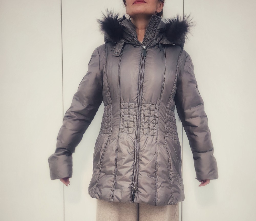 Geaca Laurèl groasa, cu puf, mas.38/M, gri-sidefat, cu gluga