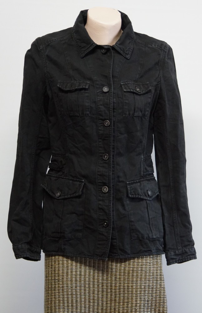 Geaca Prada neagra , marimea 40 , made in Bulgaria , 55%bumbac -45% in , inchidere frontala cu nasturi , doua buzunare in talie si doua la piept , dimensiuni : intre umeri 40cm , bust90cm , lungime maneca 60cm , lungime geaca67cm