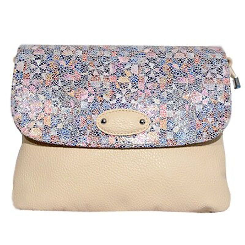Material exterior din piele naturala de culoare bej, in combinatie cu piele naturala multicolora. Captusit interior din material textil sintetic. Geanta are trei compartimente, este spatioasa si se inchide cu capsa magnetica si fermoar. In interior se afla doua buzunare pentru telefon, carduri, cartele. In exterior, geanta are pe partea din spate doua buzunare inchise cu fermoar. Bareta este ajustabila, confectionata din piele naturala. Accesoriile metalice sunt de culoare argintie.