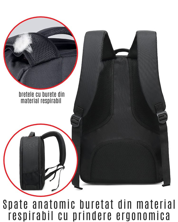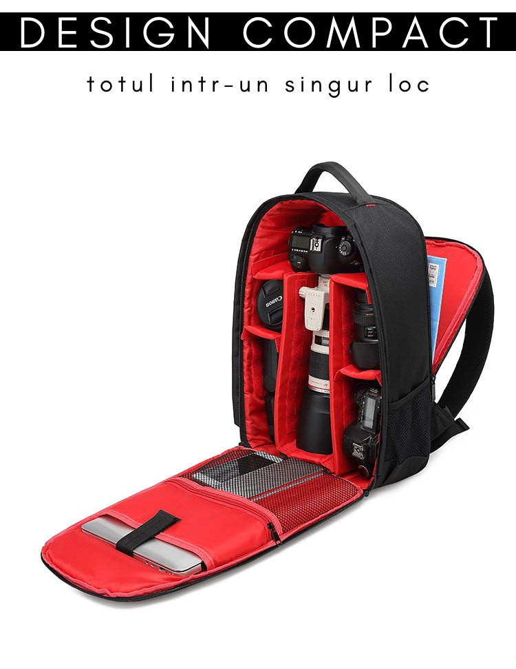 - Spatiul intern al rucsacului nostru pentru camera este suficient pentru a tine camera, obiectivul, blitul etc. Puteti folosi partitia detasabila pentru a rearanja spatiul de stocare pentru articolele tale.