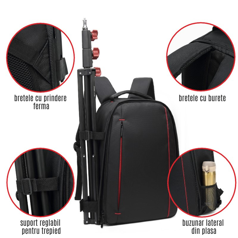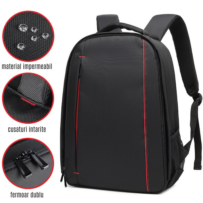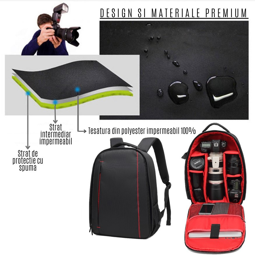 Geanta / Rucsac pentru camera foto SLR, DSLR si accesorii, impermeabil, suport trepied, obiective, spatiu laptop, rezistent la socuri, compact, Negru