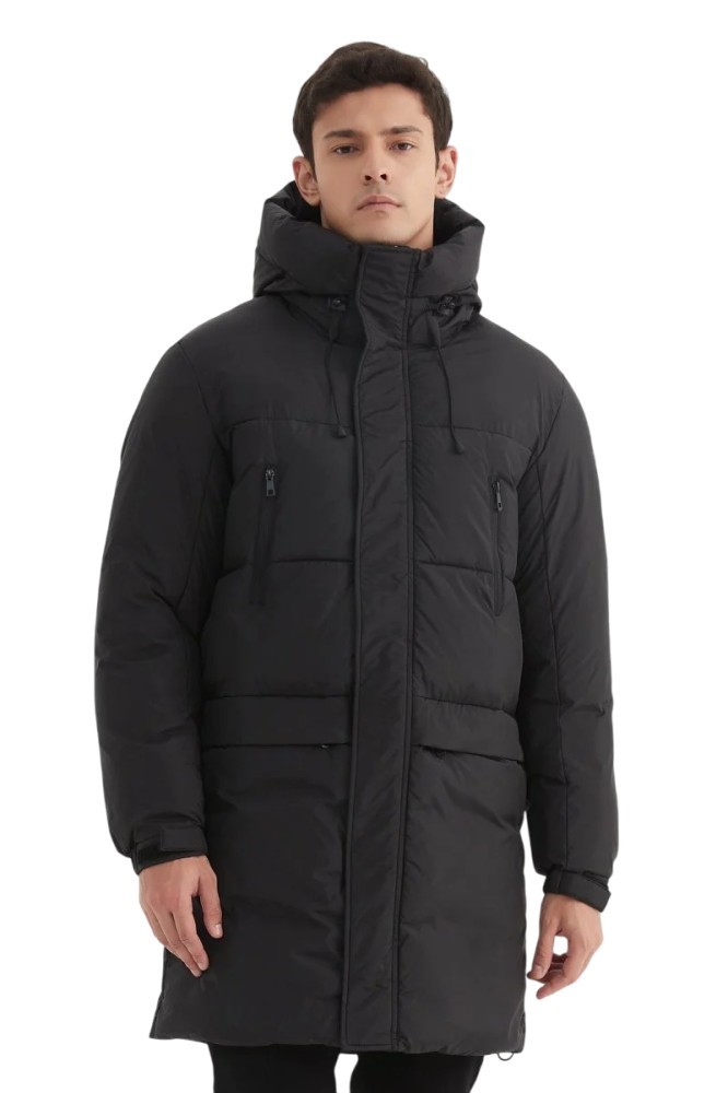 Jachetă lungă, glugă integrată cu șnur de strângere, închidere cu fermoar, 4 buzunare cu fermoar, guler ridicat, logo Kymaxx de-a lungul fermoarului din plastic, închidere cu velcro, material cu tehnologie Water Repellent.