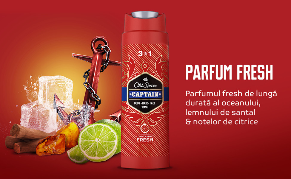 Parfum oceanic. Old Spice Captain aduce tinuta de gala cu un parfum suav si sociabil care nu a auzit de 'faux pas' (a da gres).Gelul de dus Old Spice Captain are un parfum oceanic, cu note citrice si lemn de santal. |