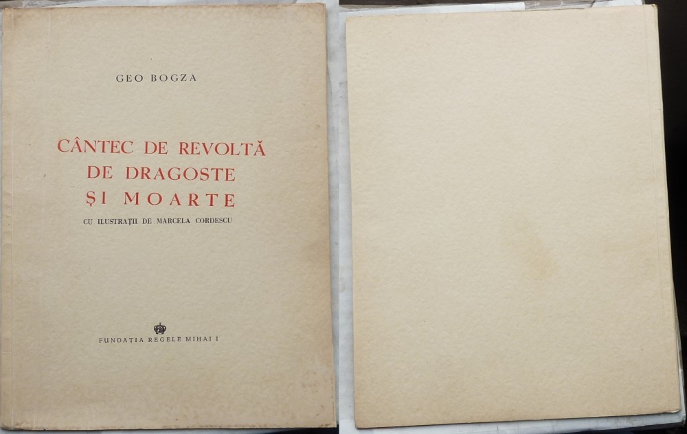 Geo Bogza, Cantec de revolta, de dragoste si moarte, cu ilustratii de Marcela Cordescu, 1945, prima editie in stare foarte buna. Dimensiuni: 28 x 22 cm, hartie de calitate, 40 pagini.