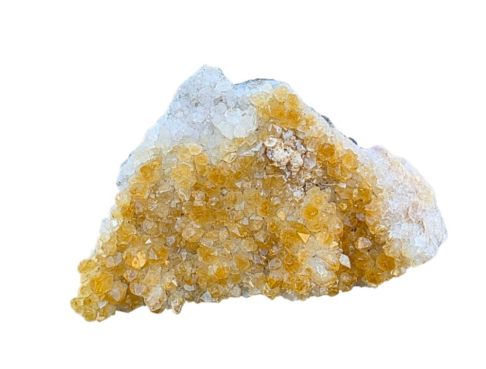 Geod de citrin natural, varietate de cuarț cu nuanțe intense de galben-auriu până la portocaliu deschis, dispus în cristale prismatice bine dezvoltate pe matrice de rocă. Suprafețele cristaline prezintă transparență bună și luciu sticlos, cu reflexii luminoase care evidențiază claritatea și saturația culorii. Structura compactă a agregatului de cristale, trecerea graduală de la zonele albe-lăptoase de cuarț spre centrul intens colorat și prezența bazei brute cu aspect verde-maroniu confirmă formarea sa naturală.