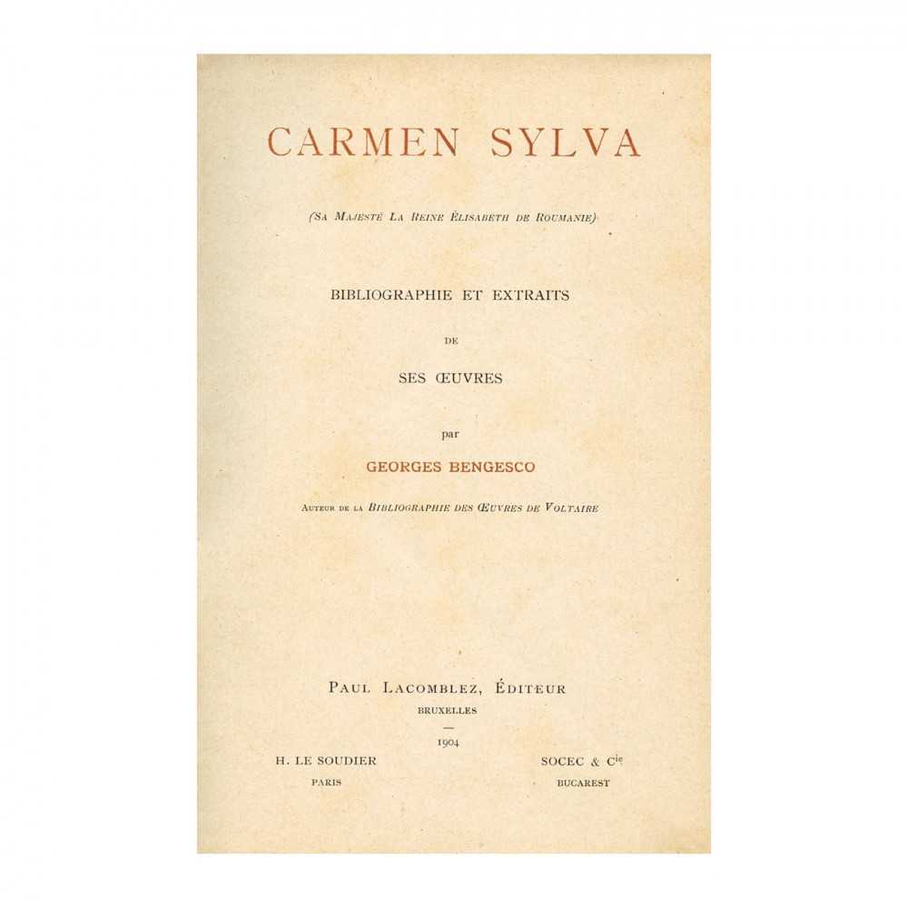 George Bengescu, Carmen Sylva. Bibliographie et extraits de ses œuvres, Bruxelles, Paul Lacomblez Éditeur, 1904, LXIV + 303 p. La începutul volumului regăsim o heliogravură ce ne-o înfățișează pe regina Elisabeta în pădure. Legătură contemporană integal din piele.