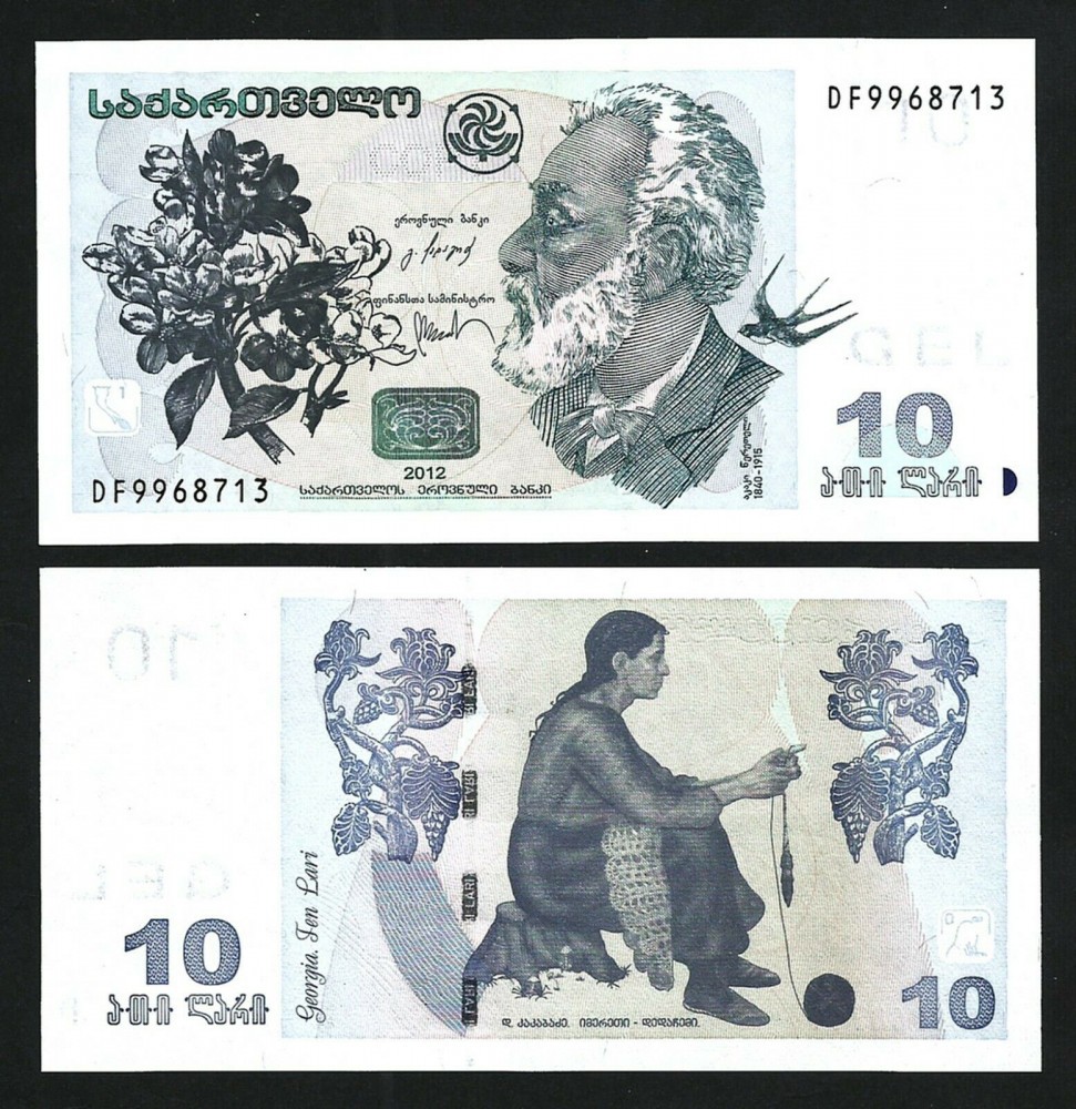 Splendida bancnota de 10 Lari din Georgia 2012 (P-71d) în stare necirculatã (UNC).