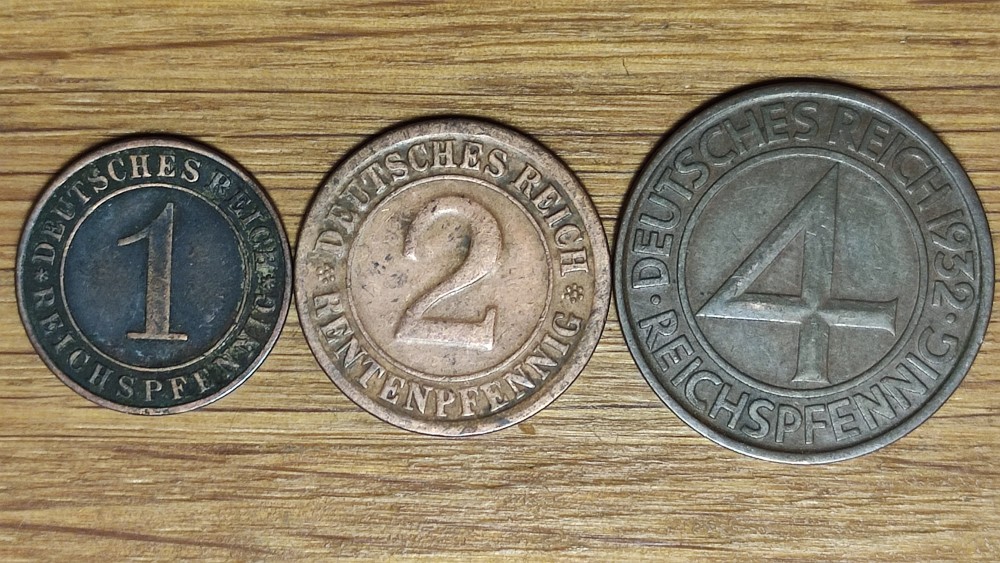 Germania nazista / Weimar - set 3 monede frumoase - 1 + 2 + 4 pfennig 1924 - 1929 - 1932 - ultima foarte rara