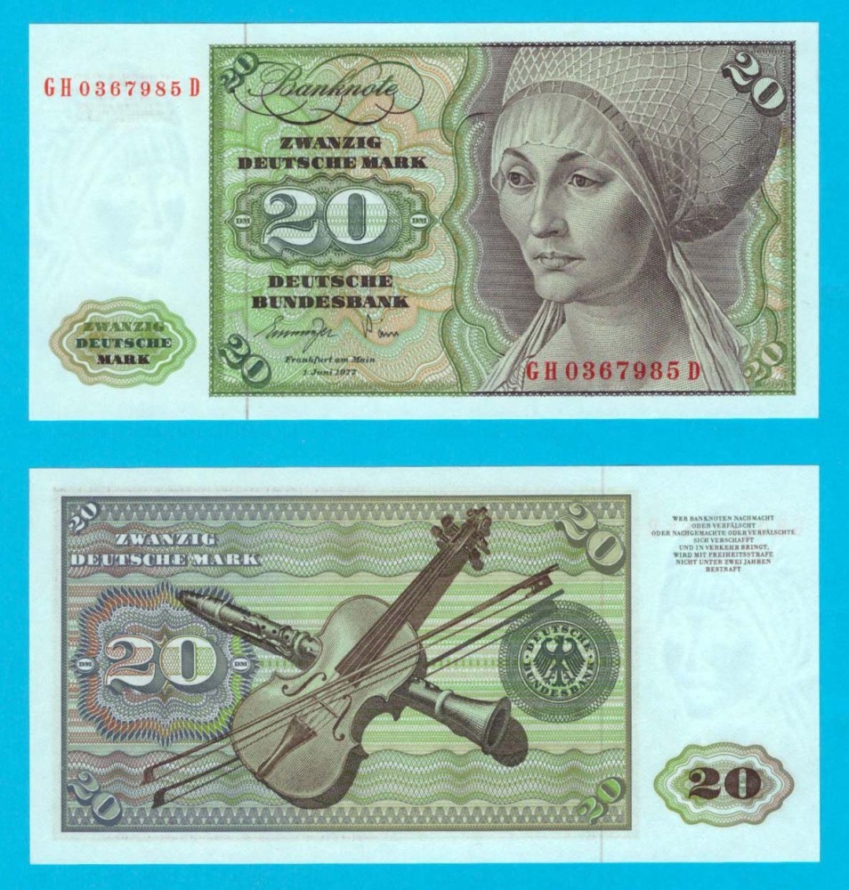 Germania RFG (p#32) 20 Deutsche Mark 1977 UNC 'Tucher' serie: GH0367985D Seria: Picturi; faţă: "Portretului Elsbethei Tucher", pictată de Albrecht Dürer în 1499; verso: Vioară și clarinet; material: hârtie; dimensiuni: 140x70 mm;