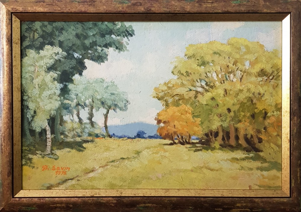Gheorghe Savin- Drum prin padure- ulei pe carton semnat si datat 1975- dimensiuni 58x42 centimetri cu tot cu ramă - 48x32 fara rama.
