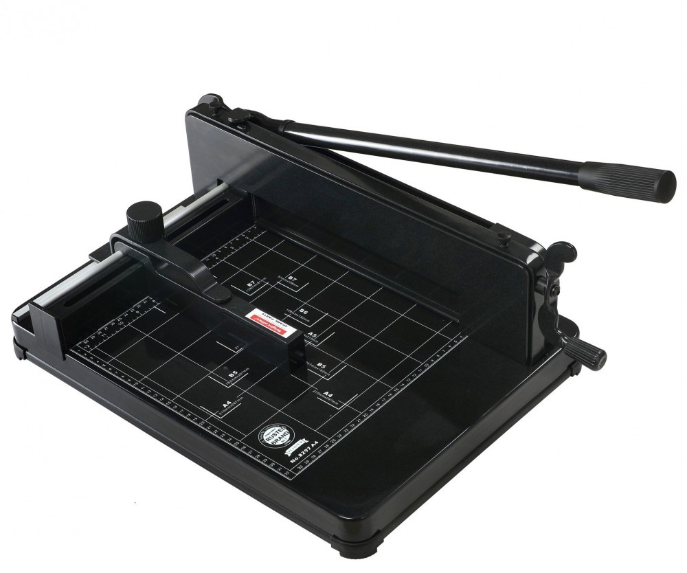 Ghilotina are o capacitate de taiere de maxim 400 coli si este prevazuta cu marcaje pentru format hartie A4, B5, A5, B6 si B7. Aceasta este prevazuta cu un ghidaj care va ajuta sa setati dimensiunea de taiere dorita.