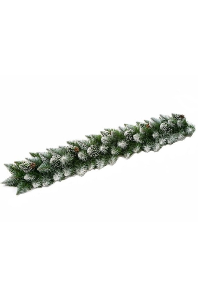 Ghirlandă artificială de Crăciun cu zăpadă și conuri.; Fabricată din poliester, metal, con și zăpadă din poliester.; Ramurile pot fi îndoite și modelate după dorință.; Potrivită pentru utilizare în interior sau în exterior.; Culori: Verde și alb.; Lungime: 270 cm.; Include specificații generale ale produsului pentru un context suplimentar.
