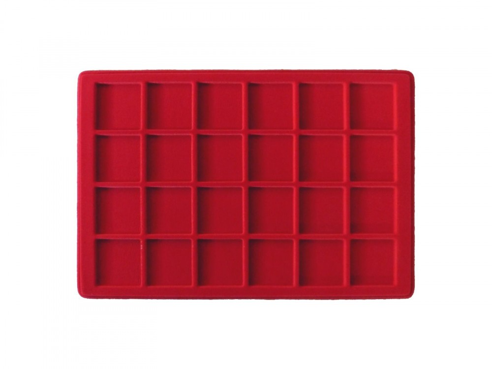 SAFE 323 Tava in catifea rosie pentru 24 monede de 45mm Baza este imbracata in silicon gros de aprox. 2mm grosime si acoperita in catifea rosie. Dimensiuni tava: 220 x 330 mm. Se potriveste in valizele de monede Gigant si Black Special