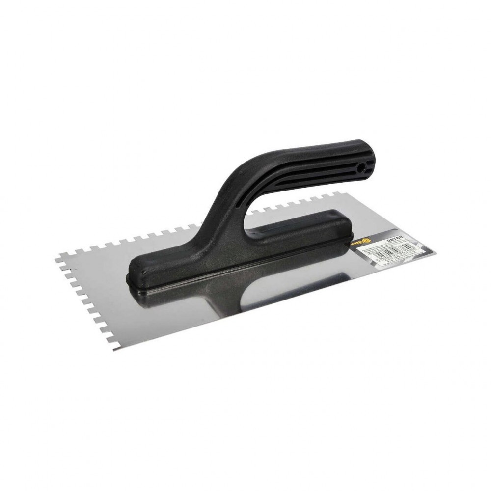 Confecționat din tablă de oțel inoxidabil a unui plutitor, dimensiuni 270x125 mm, cu dinți de 6 mm. Mâner din plastic confortabil și ușor. Indispensabil atunci când se aplică adezivi, tencuieli și grunduri.