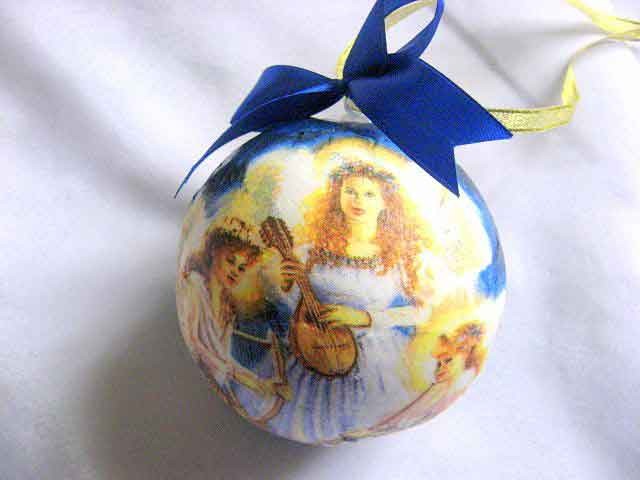 glob brad iarna cu ingerasi 29891. Produs lucrat manual din categoria decoratiuni pentru sarbatorile de iarna / sarbatoare Sfantul Nicolae, sarbatoare nastere Iisus Hristos– cadouri pentru copii de la Mos Craciun si sarbatoare An nou. Globul are ca design un model ce reprezinta ingerasi. Are o funda albastra. Glob realizat manual pe bila de polistiren cu tehnica servetelului, pictat cu pasta de structura si acuarele acrilice, lacuit cu lac ecologic. Diametrul este de 10 cm.