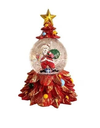 Adaugă un strop de magie sărbătorilor cu acest glob de Crăciun decorativ tip brăduț, prevăzut cu efect spectaculos de ninsoare cu sclipici și melodie muzicală festivă. Cu stea aurie în vârf și un design elegant în nuanțe de roșu intens, este accesoriul perfect pentru decorarea mesei, a biroului sau a vitrinei de Crăciun.