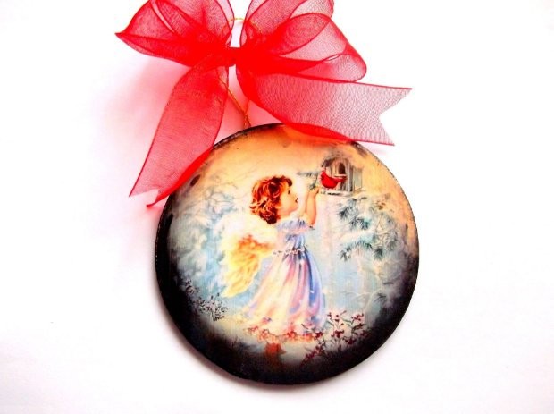glob pe lemn ,glob cu copil ingeras si pasare rosie, 40117. Glob pe lemn decorat manual cu tehnica decupaj si lacuit cu lac ecologic pe baza de apa. Globul are ca imagine principala un copil ingeras cu o pasare rosie. Globul are o funda de culoare rosie.