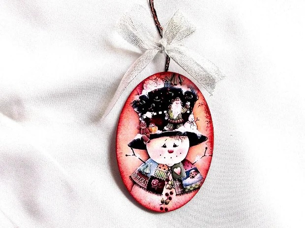 Glob pe lemn , Glob de Mos Craciun cu om de zapada cu joben, 42061. Produs lucrat manual, glob pe lemn de Craciun / sarbatori de iarna. Dimensiuni: 10 cm / 7 cm. Produsul este plat si are design doar pe o parte.