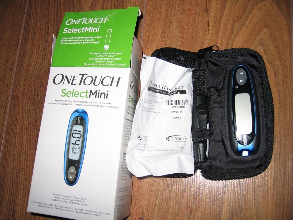 One touch - Nou, nu l-am folosit, nu are baterie si teste. Contine ce se vede in poza, ace, husa, intepator sigilat.