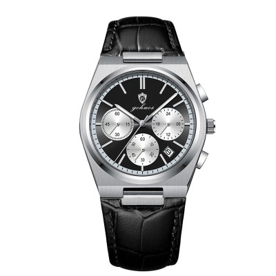 Gohuos, Ceas barbatesc de mana, Quartz, Afisare data, Analog, Cronograf, Piele naturala, Negru Argintiu