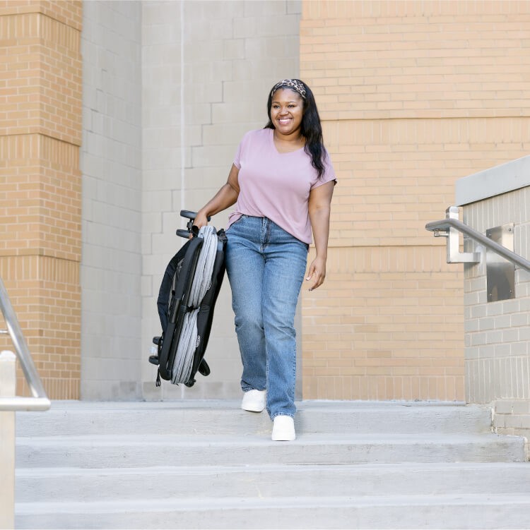 Operarea cu o singura mana iti permite sa manevrezi caruciorul chiar si cand tii copilul in brate. Dupa pliere, ramane compact si usor de transportat.