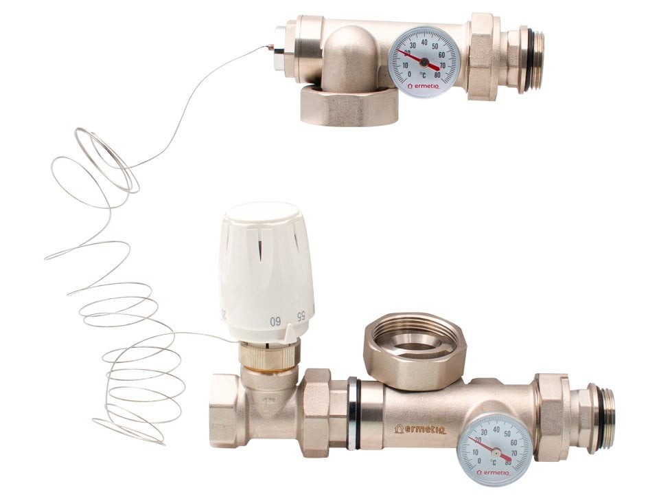 amestec termostatic, robineți cu bilă și termometru pe tur și