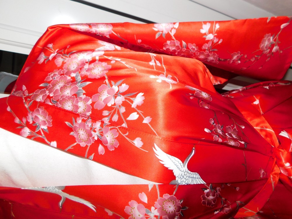 Halat , neglije matase naturala originala Japonia, imprimeu cocori, elemente pictate manual cu auriu (staminele florilor ) inchidere cordon , nu are nasturi, este neglije , superb, masura 42