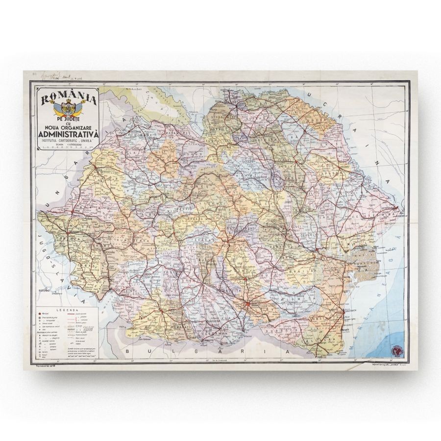 Harta pe județe a României, cu noua organizare administrativă, realizată la o scară de 1:1.000.000 în Institutul Cartografic Unirea din Brașov. Dimensiuni 65 x 85 cm