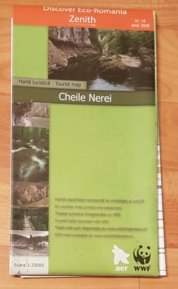 Harta turistica Cheile Nerei. Discover Eco-Romania. Zenith, 2018. Scara 1:25000. Este noua